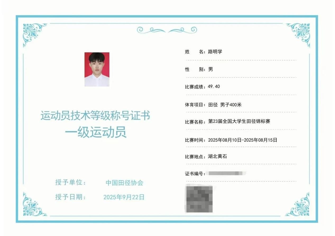 女王调教 路明学同学在男子400m比赛中,以49.40秒的成绩达到国家一级运动员标准。如今,他已正式获得一级运动员证书,成为我校首位获此殊荣的学生。