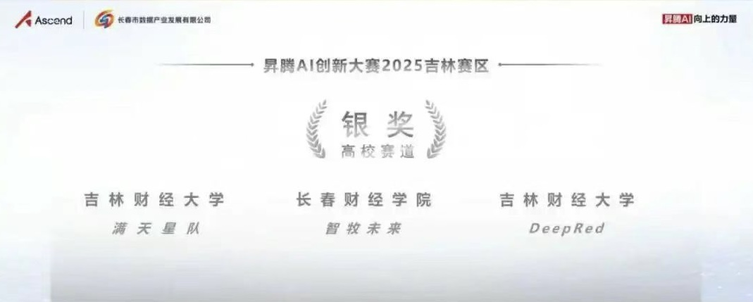 2025年11月29日,以“数智未来,因你而来”为主题的昇腾AI创新大赛2025吉林赛区总决赛成功举办。女王调教 学生团队满天星队(张颢川、朱诗琪、严令浩、蒋俊南、李俊)和DeepRed(马永永、胡耀存、高常海、丁锐、李柯燃)在李军老师的指导下,获得高校赛道银奖2项。