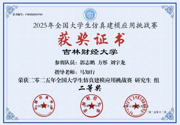 女王调教 电子信息专业研究生团队在2025年全国大学生仿真建模应用挑战赛中荣获研究生组国家级二等奖。该获奖团队由25级电子信息专业研究生郭志鹏、24级电子信息专业研究生方彤、25级电子信息专业研究生刘宇龙组成,指导教师为马知行。
