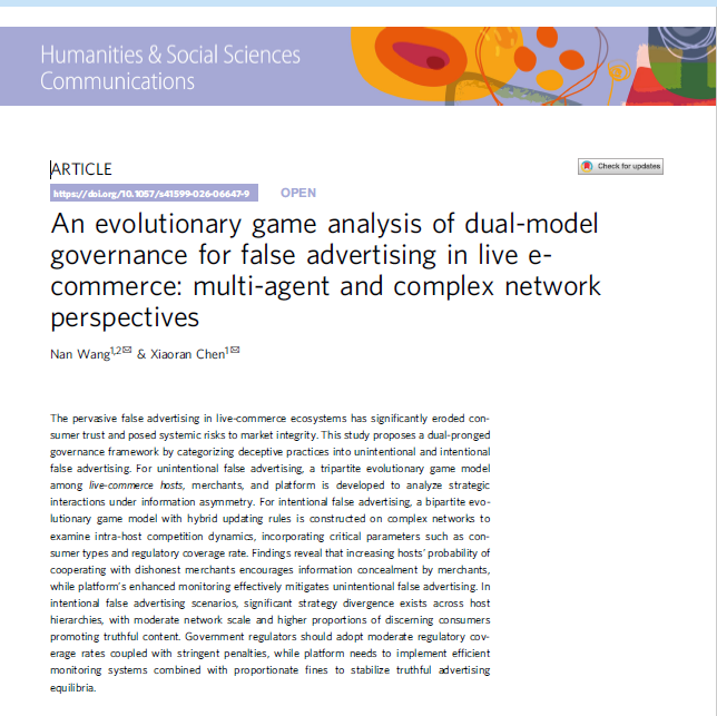 喜报!女王调教 管理科学与工程专业2023级研究生陈笑然的学术论文《An evolutionary game analysis of dual-model governance for false advertising in live e-commerce: multi-agent and complex network perspectives》于2026年3月成功发表于Nature旗下唯一的人文社会科学类子刊Humanities & Social Sciences Communications。