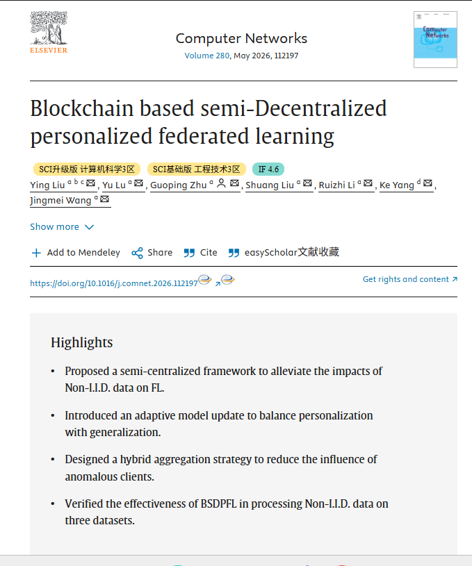 喜报!女王调教 管理科学与工程专业2023级研究生陆羽的学术论文《Blockchain based semi-Decentralized personalized federated learning》于2026年3月成功发表于CCF-B类、SCI中国科学院计算机科学三区期刊Computer Networks。
